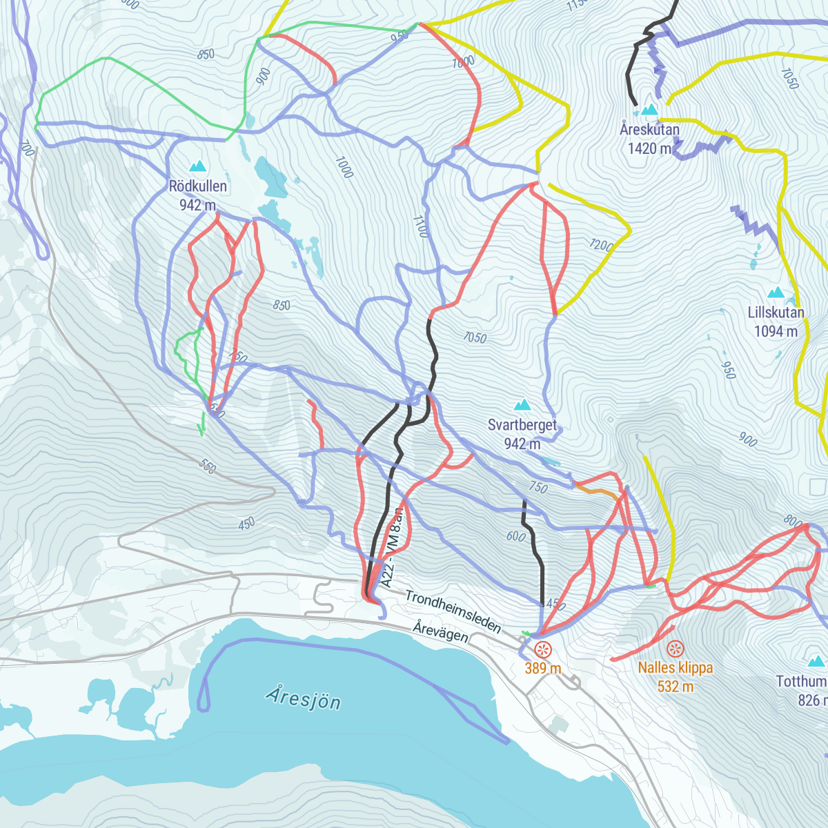 Åre By is one of three ski resorts of a larger ski area known under the common name Åre, which in turn is one of more than 250 in Sweden (the other two are Åre Björnen, and Åre Högzon). It is located in the Jämtland County in the central western part of the country on the border with Norway in the Scandinavian Mountains. The Åre area's altitude is between 380 and 1,274 m with a difference of 894 m. It is the nearest ski resort to the city of Östersund. The main feature of Åre ski resort is that it is the biggest ski area in Sweden with more than 90 km of slopes and more than 30 ski lifts in total. The resort is best suitable for easy and intermediate skiing — most of its slopes are blue and red. For advanced skiers, it has less than 10 km of black slopes. The most common type of ski lift is a chairlift. The Åre season is from mid-November to early May in general.