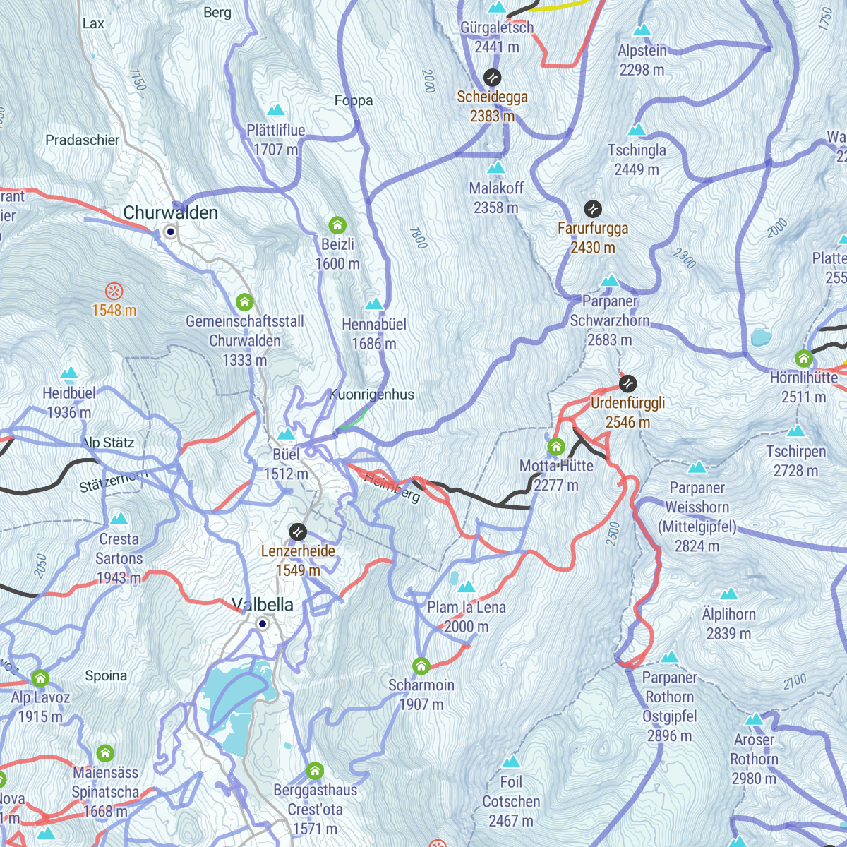 Arosa-Lenzerheide is one of more than 350 ski resorts in Switzerland. It is located in the canton of Grisons in the Eastern Switzerland region in the Bernina Range of the larger Western Rhaetian Alps of the Eastern Alps at an altitude between 1,229 and 2,865 m with a difference of 1,636 m. It is one of the nearest large ski resorts to the towns of Thusis and Chur. The main feature of Arosa Lenzerheide ski resort is that it is the second-biggest ski area in Switzerland after 4 Vallées (Verbier, La Tzoumaz, Nendaz, Veysonnaz, and Thyon), not counting also the Les Portes du Soleil, Matterhorn Ski Paradise (Zermatt, Breuil-Cervinia, and Valtournenche), and Silvretta Arena, which are partly located in other countries. The resort has more than 220 km of slopes and more than 40 ski lifts in total. It is best suitable for easy and intermediate skiing — most of its slopes are blue and red. However, for advanced skiers, the resort also has more than 30 km of black slopes. The most common types of ski lifts are a chairlift and a T-bar. The Arosa Lenzerheide season is from early November to mid-April in general.