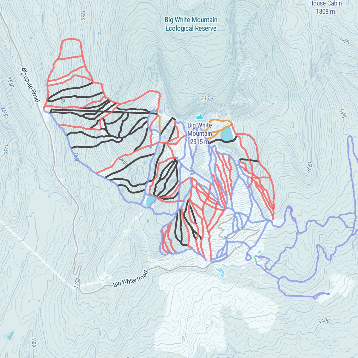 Big White Ski Resort is in the Regional District of Kootenay Boundary of southern British Columbia. It lies within a subrange called the Beaverdell Range. This range is between West Kettle and Kettle Rivers and is oriented north to south. It just sneaks into the west side of the Canadian Rockies. The resort is also within the bounds of the Big White Mountain Ecological Reserve, a protected area full of alpine tundra, fir forest, and freshwater rivers.
