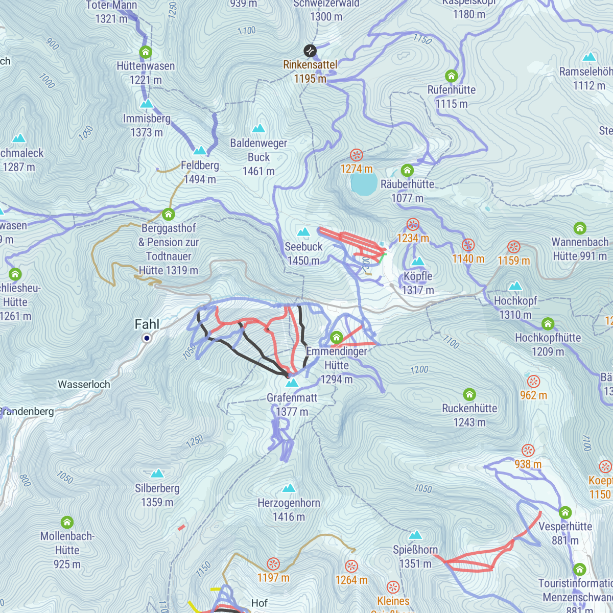 The main on-mountain trails lead to the summits of the Grafenmatt and Feldberg, taking skiers above the area serviced by chairlifts. The route from the base at Seebuck runs south of the downhill area, cutting into the forest before the main ascent through the open ridge that leads to the top, passing under Seebuck tower. The summit is slightly over 3 km (2 mi) and 200 m (656 ft) above the starting point. From there, you can ski down or continue to the village of St. Wilhelm, 4 km (2.5 mi) down the line.