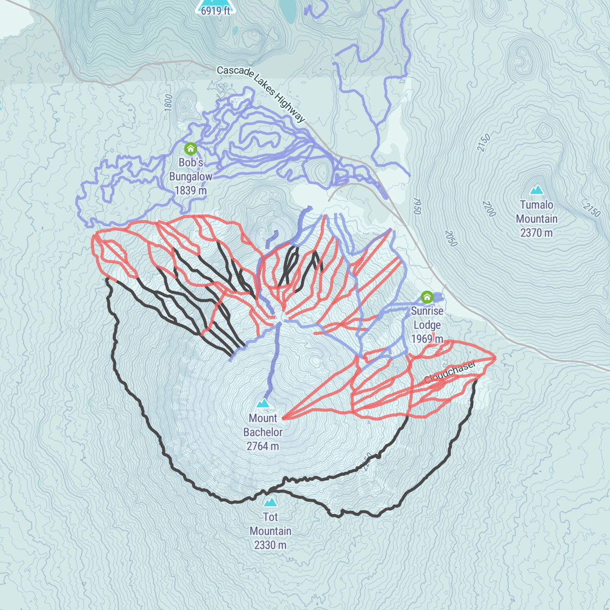 Criss-crossing through the forest of conifers is a maze of runs and glades. Most lifts and named runs at Mt. Bachelor are on its northern face. The backside, accessible only by the Summit Lift, has no groomed runs, except a few traverses that lead around the peak back to the base area. The back side is home to the resort’s steepest slopes and a paradise for tree skiing aficionados.