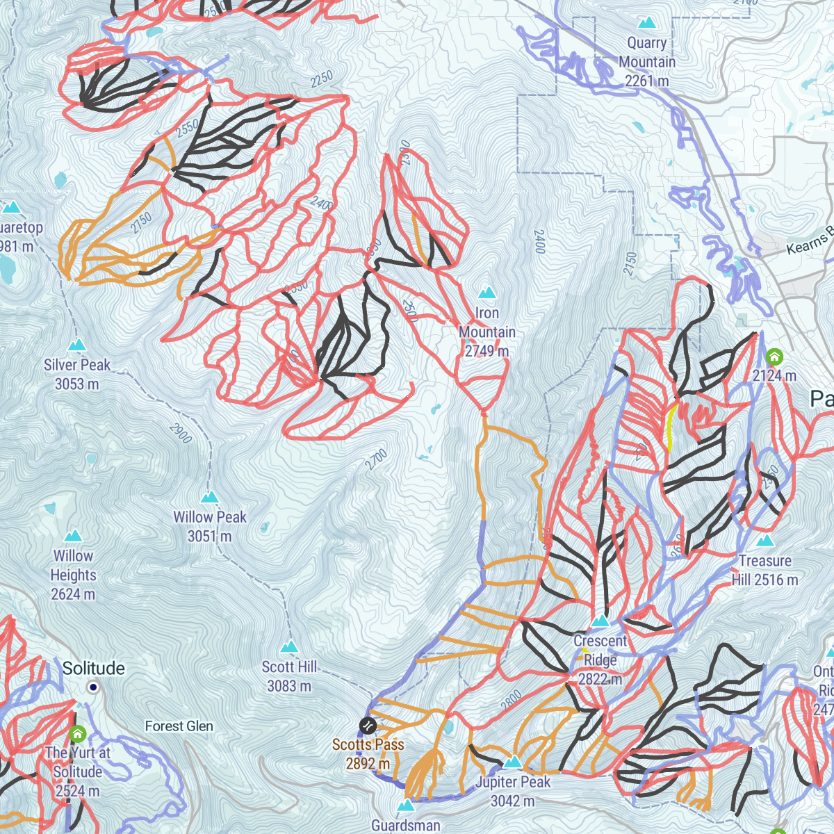 While PCMR, especially the Canyons side, offers excellent steeps and powder skiing, there isn’t too much in the way of ‘extreme’ skiing. Only the top of the resort is above the treeline. There aren’t many cliffs or chutes in bounds. The upper peaks are smattered with stunted pine trees, which are great for storm skiing because they provide contrast and visibility.