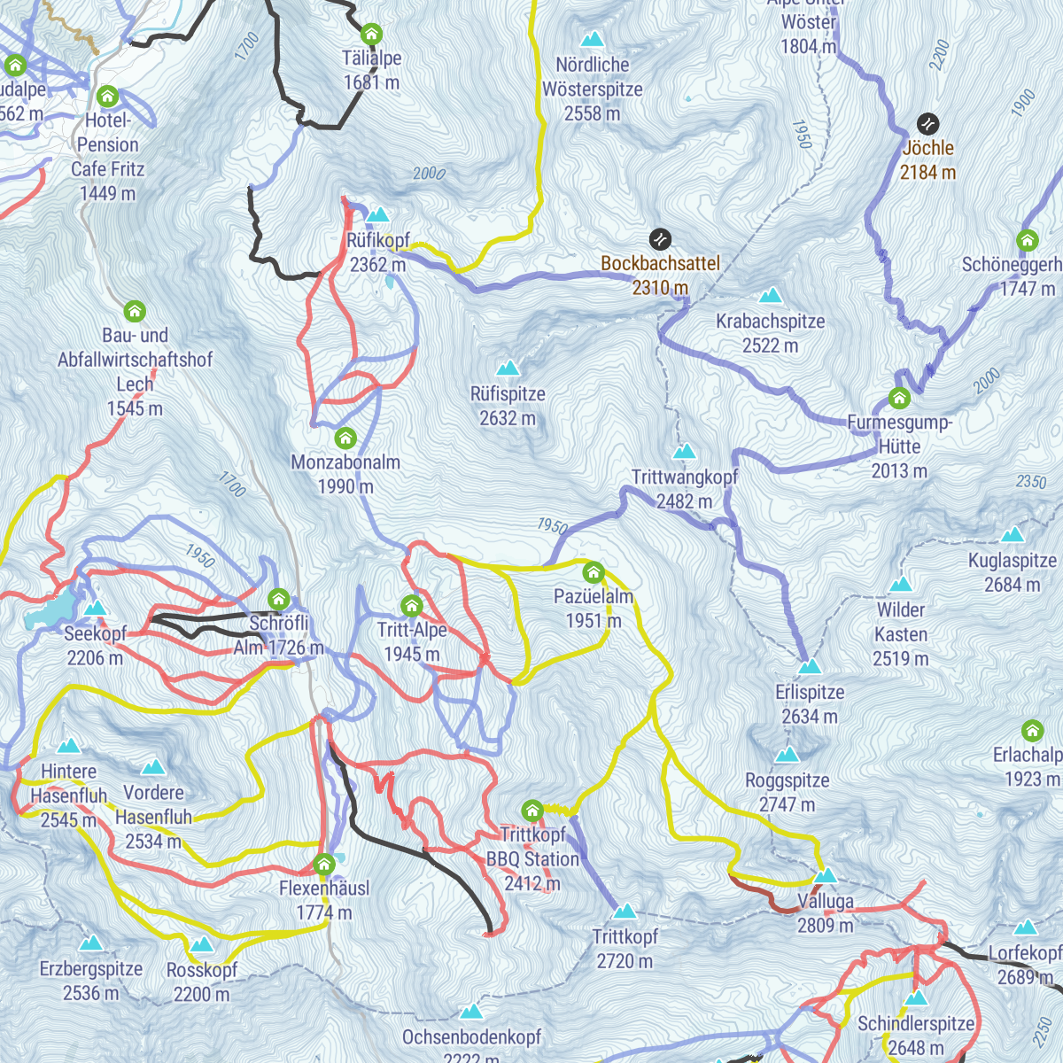 Though all off-piste ski routes are considered experts-only terrain, they vary in difficulty. The easier routes are marked as red dashed lines on the map (– – –), while the more extreme routes are printed in black (– – –). Ski Arlberg has no shortage of epic ski routes to get your blood pumping.