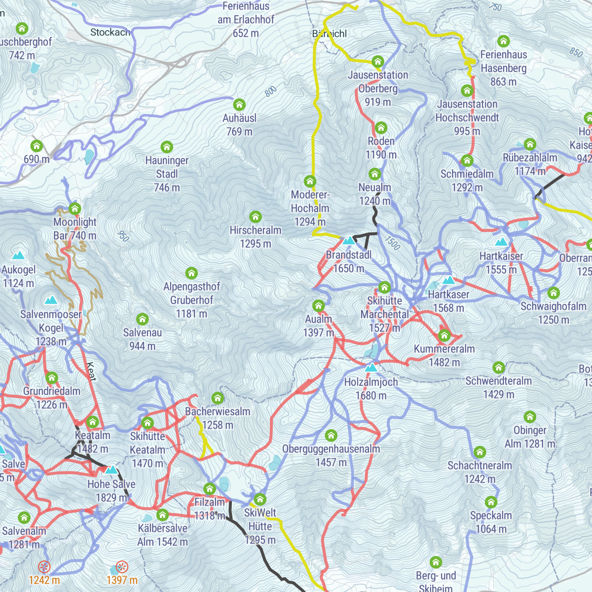 SkiWelt is one of more than 400 ski resorts in Austria and one of more than 150 in Tyrol. It is located in the east of the state in the Wilder Kaiser Mountains of the larger Kaisergebirge group of the even larger North Tyrol Limestone Alps range of the Eastern Alps at an altitude between 620 and 1,869 m with a difference of 1,249 m. It is the nearest ski resort to Kitzbühel, the largest city to the east of the resort, however the bigger Salzburg is also not far away. The main feature of SkiWelt ski resort is its incredible diversity that combines geographical accessibility, 21 downhill runs, panoramic views of more than 70 peaks higher than 3,000 m, Igloo Village, three fun parks instead of just one, and 80 mountain huts. Not least of all, it is Austria’s leading resort for night skiing with 10 km of illuminated slopes. In total it has more than 260 km of slopes and more than 80 ski lifts. It is also in the top 5 ski resorts in the country by size. The resort is best suitable for easy and intermediate skiing — most of its slopes are blue and red in about equal proportions. For advanced skiers, the resort has just about 10 km of black slopes. The most common type of ski lift is a chairlift but also a gondola lift. The SkiWelt season is from early December to mid-April in general.